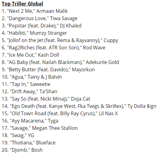 Other Nigerian entries on the global charts include, Adekunle Gold's 'AG Baby' and Mayorkun's 'Betty Butter' featuring Davido at eight and nine respectively. The top US charts was topped by Kash Doll's, 'Ice Me Out' while the global chart was topped by Armaan Malik's 'Next 2 Me' for the third straight week.