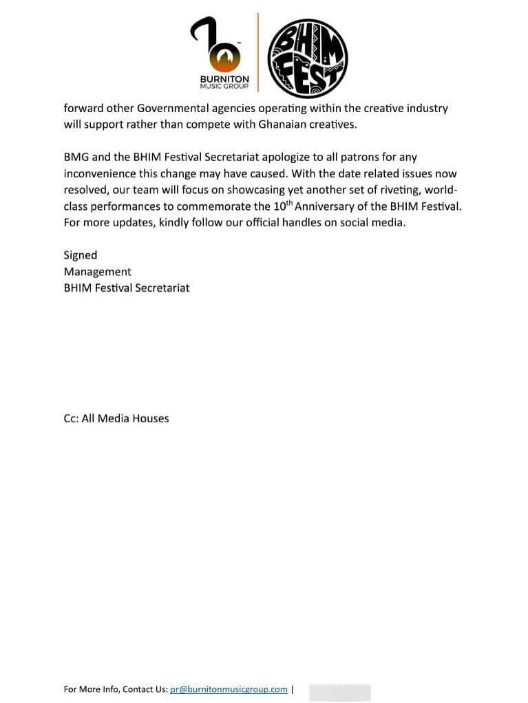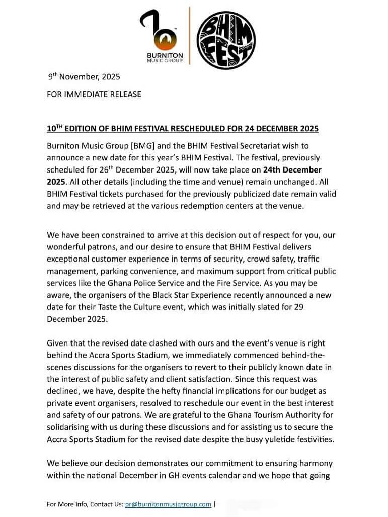 BMG explained that the change became necessary after the organisers of the Black Star Experience announced a new date for their Taste the Culture event, originally slated for 29 December, which now conflicted with the BHIM Festival. Both events are set to be held in close proximity, with Taste the Culture taking place just behind the Accra Sports Stadium, the venue for the BHIM Festival.