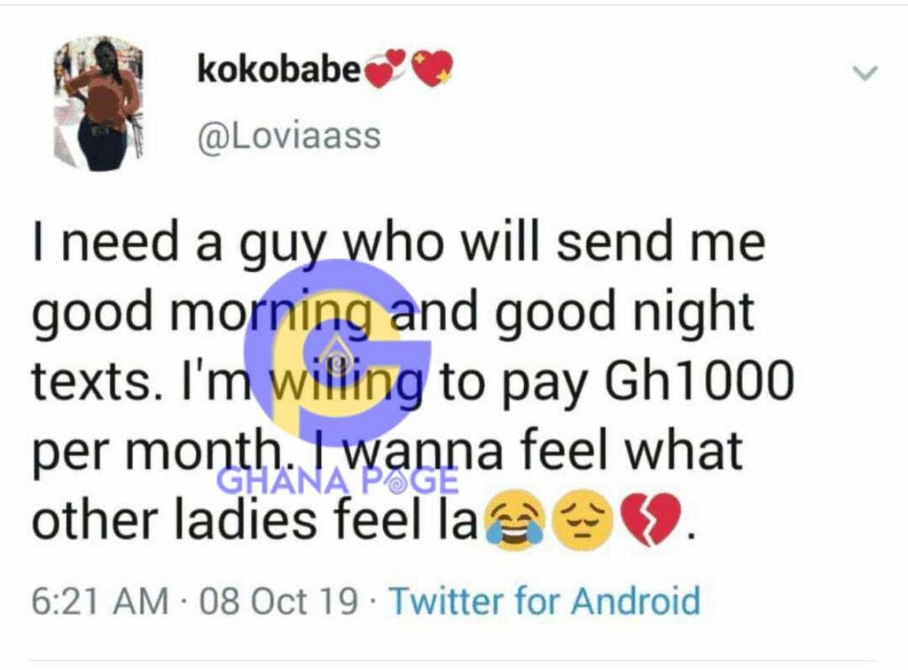“I need a guy who will send me a good morning and goodnight texts. I’m willing to pay GH¢1000 per month,” @Loviaass wrote on twitter.