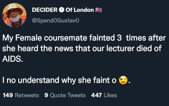 My Female coursemate fainted 3 times after she heard the news that our lecturer died of AIDS.
