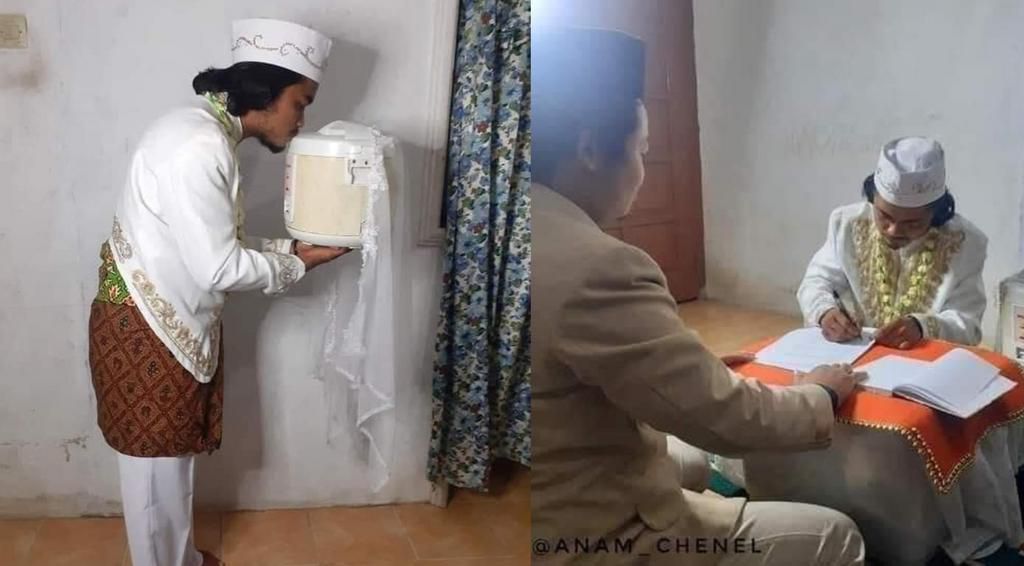 The Indonesian man who could not hide his joy after tying the knot the veil-wearing rice cooker took to social media to upload photos of the marriage ceremony which was sealed and signed at the registry.
