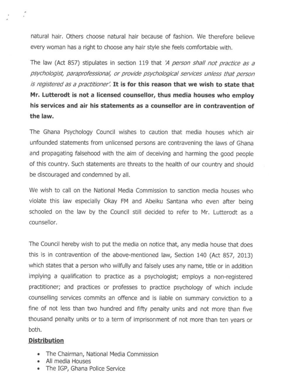 The Ghana Psychology Council has issued a strongly worded statement warning media houses to desist from employing the services George Lutterodt and referring to him as a counsellor.