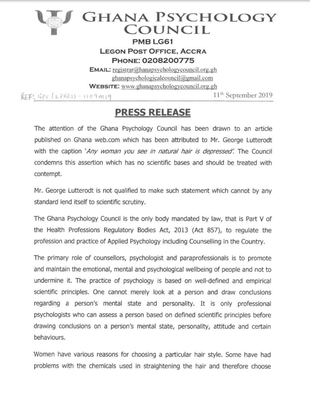 The statement follows the recent comment by Lutterodt that women who wear natural hair are depressed.