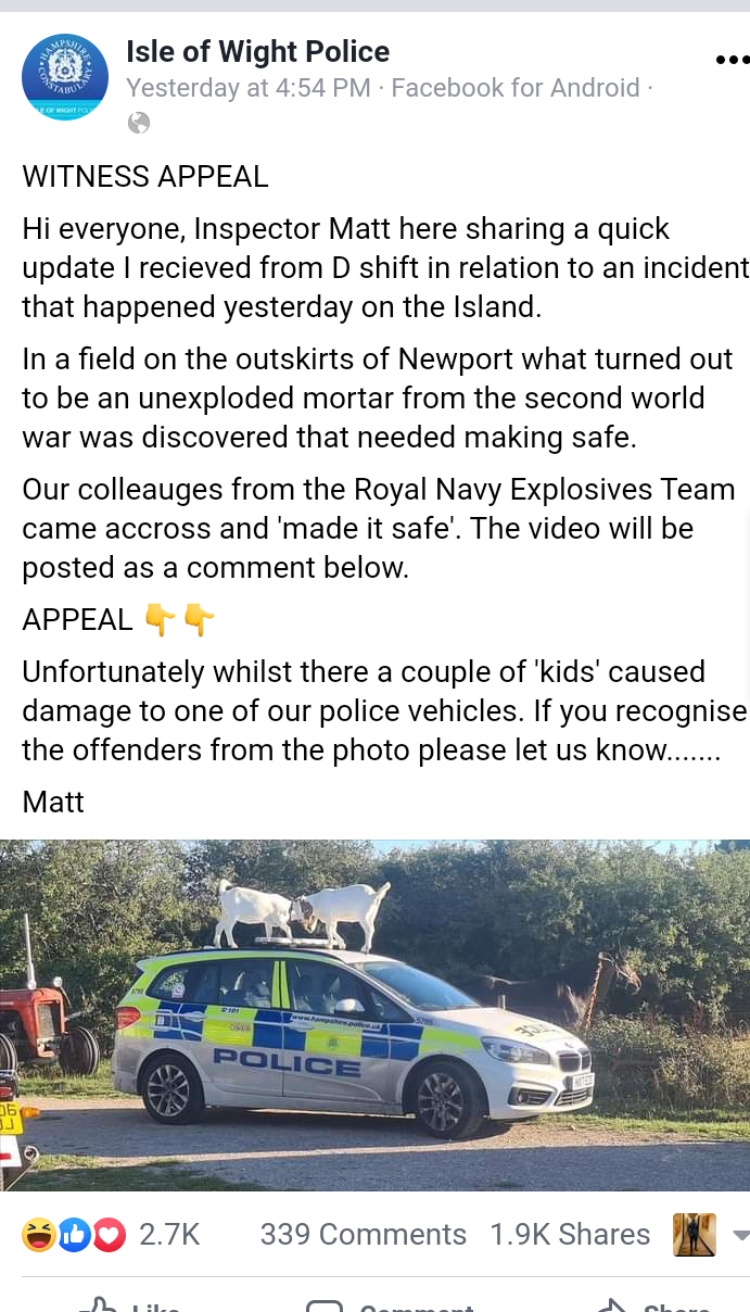 According to police, the goats were pictured standing on top of the police vehicle near Newport on Wednesday afternoon August 19, as Police had been called to the area after an unexploded bomb from World War II was discovered.