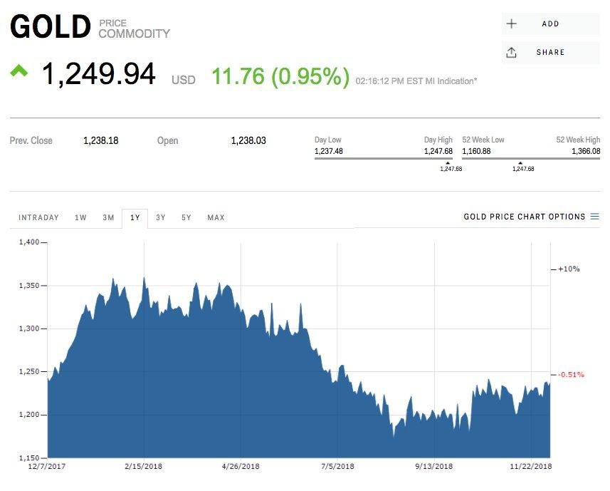 Spot prices of the yellow metal climbed 1% at 2:15 p.m. ET to around $1,250 per ounce, the highest since July. Meanwhile, the greenback fell against a basket of peers.