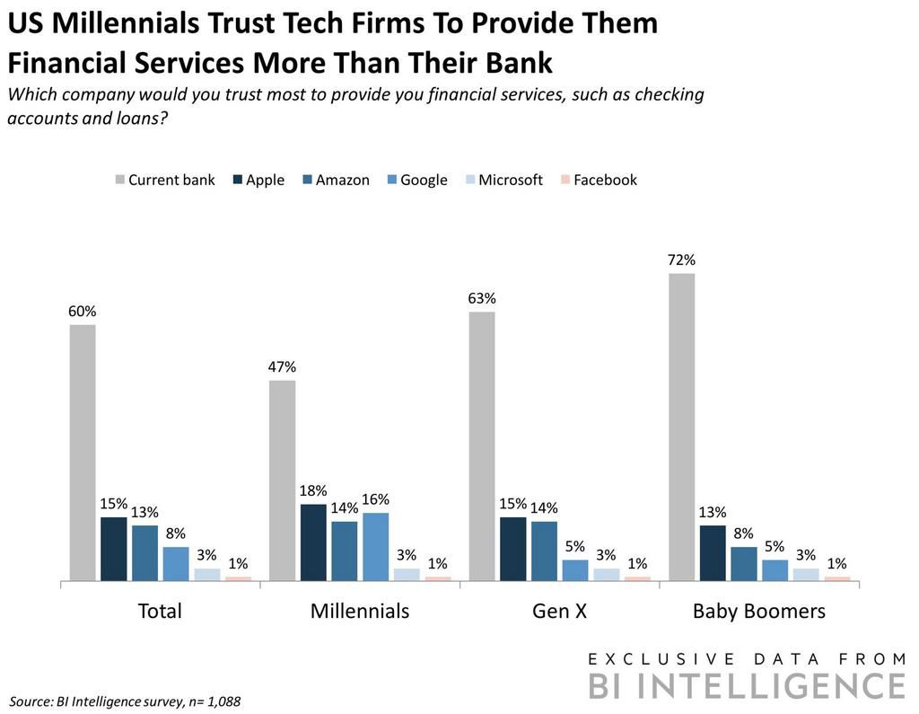 - However, these firms have to overcome major barriers to compete against legacy players, which includes regulation and trust. For example, 60% of respondents to a Business Insider Intelligence survey stated that they trust their bank most to provide them financial services.
