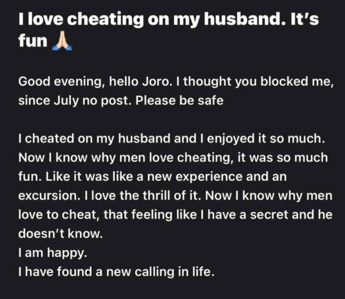 “I cheated on my husband and I enjoyed it so much. Now I know why men love cheating, it was so much fun.