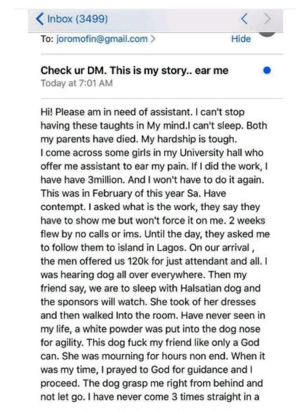 The dog sex happened at the highbrow Victoria Island of Nigeria’s Lagos state in February this year, and although she is now financially stable, she still reminisces the encounter with the foreign dog.