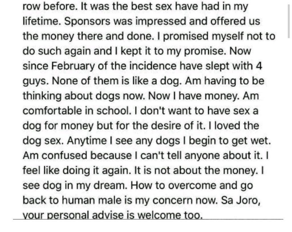 “I had 3 head-cracking orgasms during sex with a dog, now I get wet whenever I see dogs” - Student seeks advice