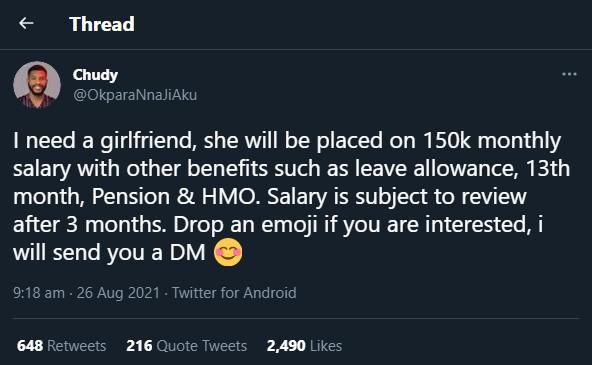 “I need a girlfriend, she will be placed on 150k monthly salary with other benefits such as leave allowance, 13th month, Pension & HMO. Salary is subject to review after 3 months. Drop an emoji if you are interested, I will send you a DM