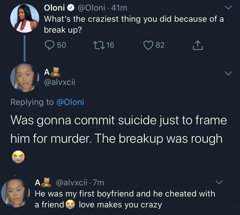 Her reply ; “Was gonna commit suicide just to frame him for murder. The breakup was rough.”