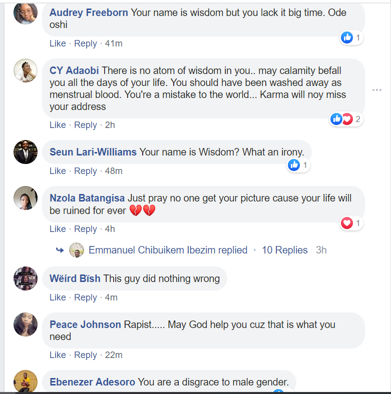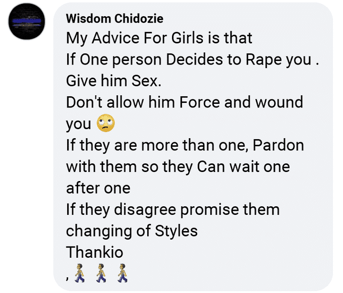 The Nigerian man identified as Wisdom Chidozie on Facebook took to his page to talk to ladies on the subject of rape and how they could be friendly to rapists to avoid being injured in the process.