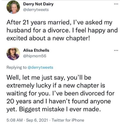 The woman identified as @hipmom56 on Twitter disclosed this while responding to another lady with username @derrytweets, who announced that she filed for divorce from her husband of 21 years.