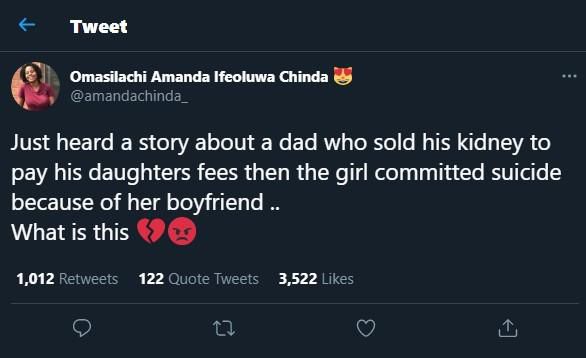 “Just heard a story about a dad who sold his kidney to pay his daughter's fees then the girl committed suicide because of her boyfriend.