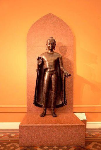 The Sultanganj Buddha, a massive bronze statue from the 6th century, was taken by British colonial authorities in India and is now displayed in the Birmingham Museum.