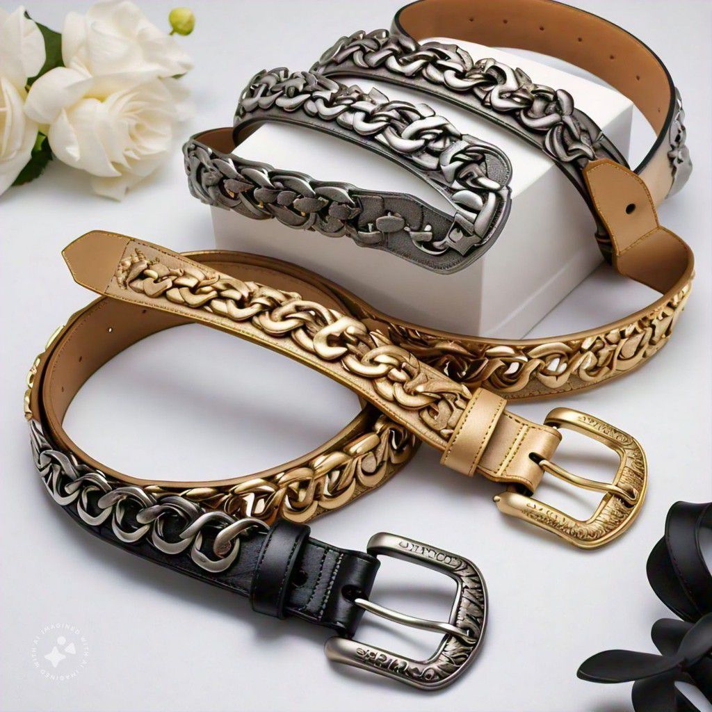 Add a touch of space-age flair with a metallic belt. Whether in silver, gold, or chrome, metallic belts bring a futuristic, polished finish to any outfit. Pair a shiny belt with a monochrome ensemble to elevate it into something more high-tech. The reflective surfaces and sleek design will complement the "AI Glamour" theme without requiring a full outfit overhaul.