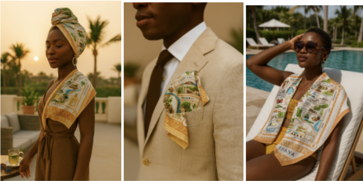 Ahead of the 2026 collection and Accra Fashion Week, BOLD Swim debuts two limited‑edition 100% silk keepsake scarves. The Ghana Illustrated Heritage Scarf, created exclusively with Ghanaian artist Michael Mensah Bonsu, celebrates Ghana’s 16 regions and cultural treasures. The African Diaspora Return to Bloom scarf is a personal piece that envisions diasporic homecoming through motifs like hibiscus, Sankofa, cowrie, roots, and the Black Star — symbols of ancestry, resilience, and Pan‑African identity. Both pieces are heirloom quality, sustainably produced, and designed to extend the collection’s storytelling beyond swimwear.