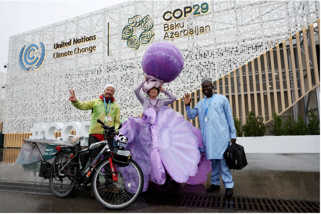 Chinese artist Kong Ning wearing a specially made "Purple Shells" art installation, poses with French climate activist David Ligouy of Peace Plus One and a visitor at the entrance of the venue during COP29. REUTERS/Murad Sezer.