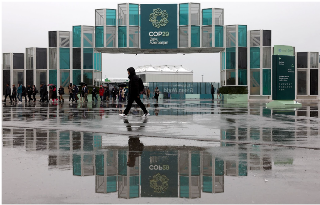 People walk at the entrance of the venue of the United Nations climate change conference COP29, in Baku, Azerbaijan. REUTERS/Murad Sezer