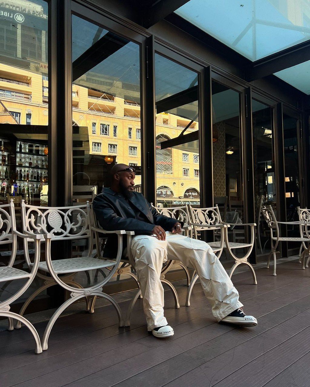 Mr. Drew opted for a cool and casual look, wearing a black jacket paired with cream trousers while lounging on a lazy bench.