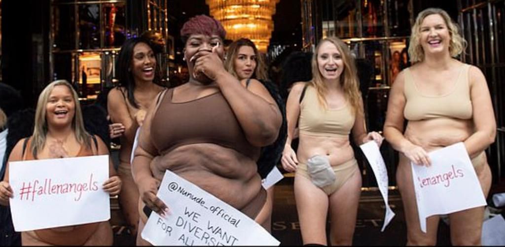 One woman carried a sign stating 'we want diversity for all brands', while another branded a placard with the hashtag #fallenangels.