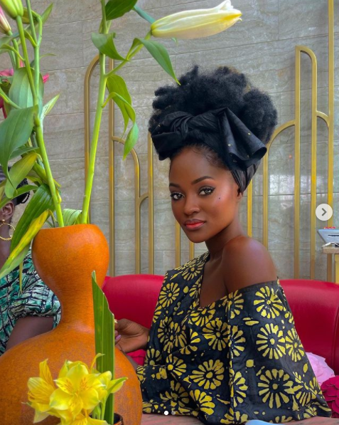 The African beauty opted for mild makeup while placing emphasis on her natural afro hair wrapped with a black headband.