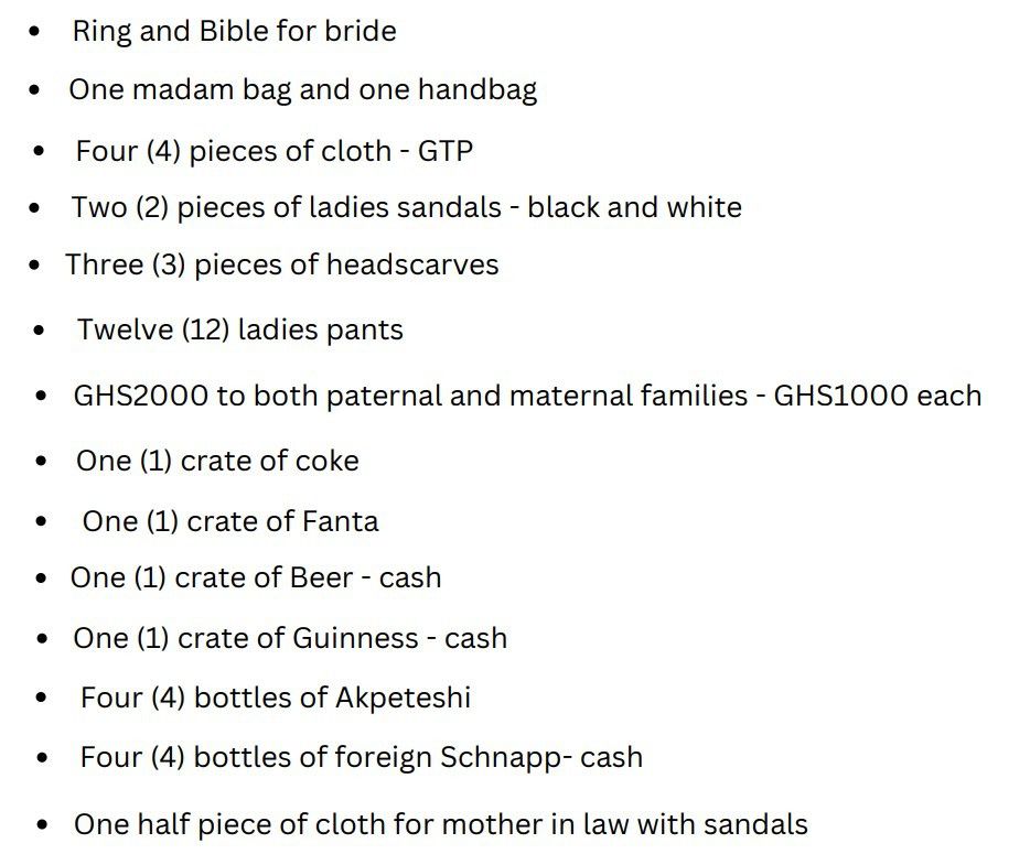 Pieces of cloth (such as Dutch print) for the mother of the bride, they even ask for a sewing machine if the woman is a dressmaker, jewellery, and capital to start a business if she's not employed. Drinks can come in various forms ranging from alcoholic to non-alcoholic.