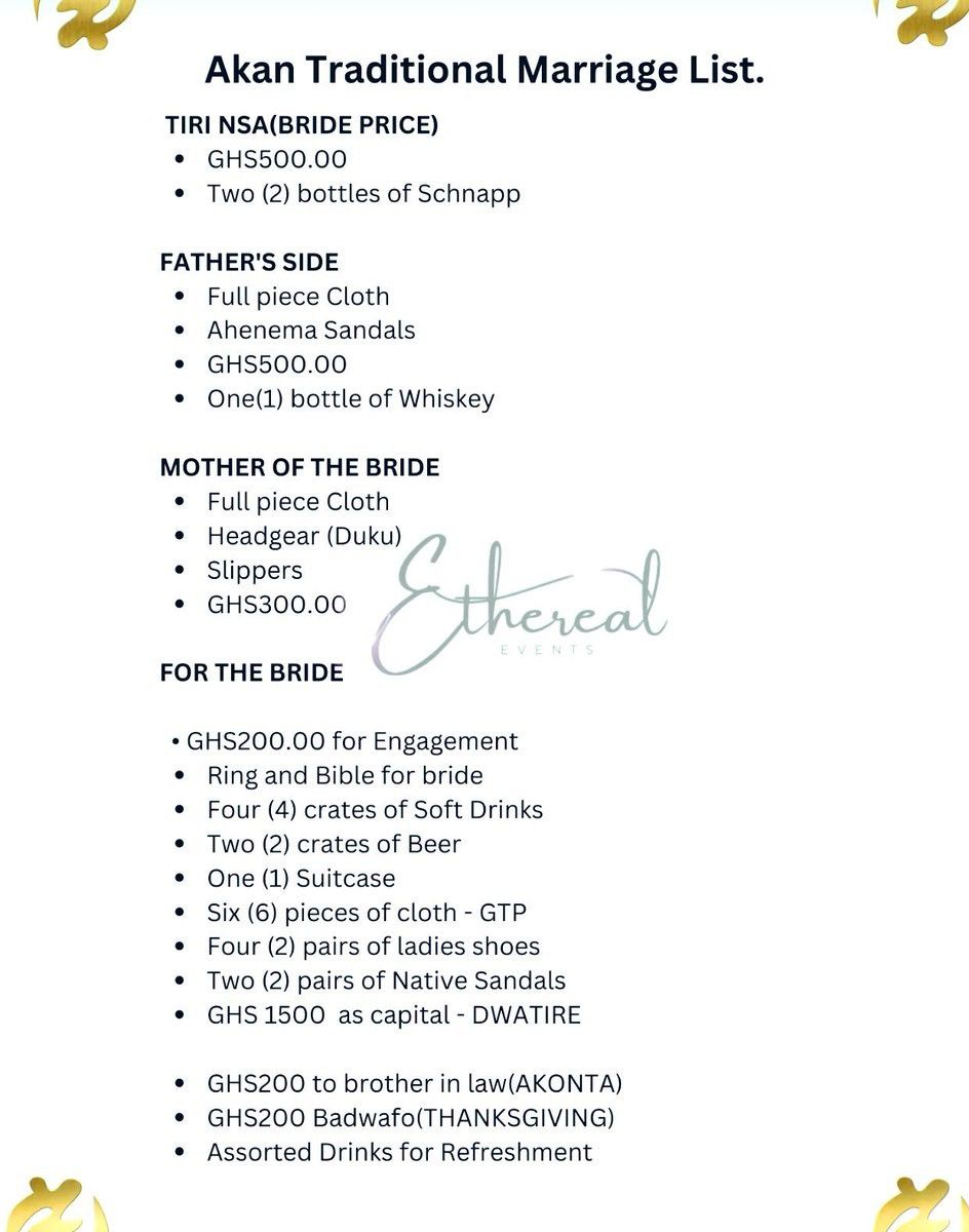 Bride price list