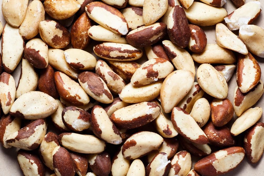 6) Healthy source of fat: Brazil nuts Nuts usually have larger amounts of minerals than other foods, Men's Health previously reported . Brazil nuts are loaded in selenium, which is important for our immune systems. An ounce of nuts is about 200 calories, 20 grams of fat, and 4 grams of protein. ParfonovaIuliia - Getty Images