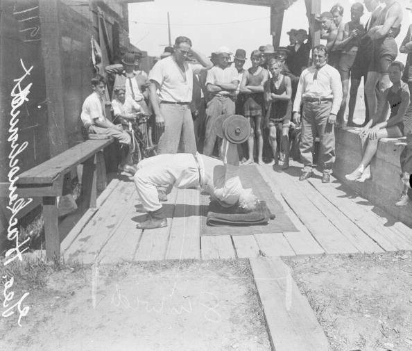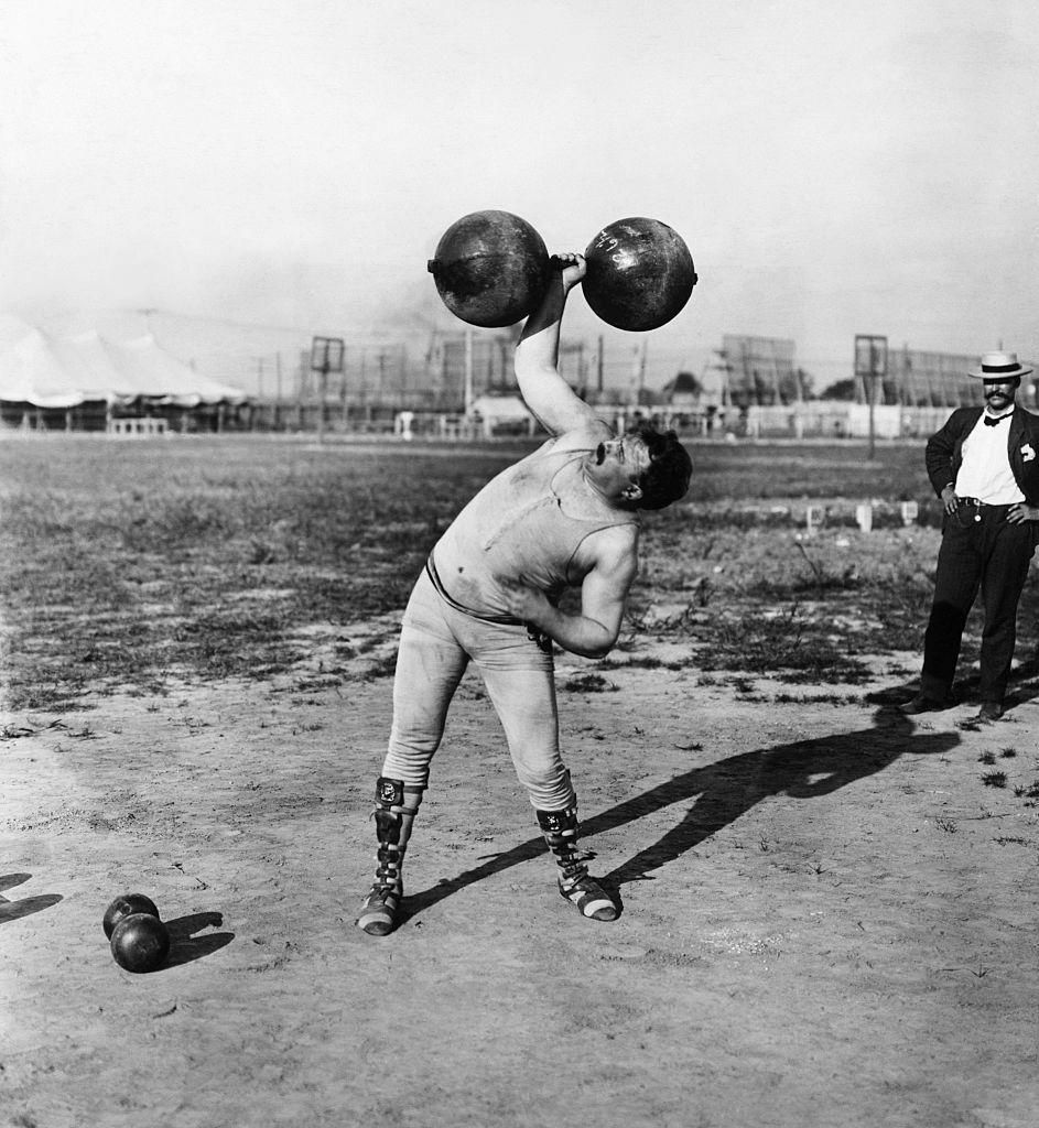 Strongman, 1910 In this photo, a strongman lifts a dumbbell over his head. Getty