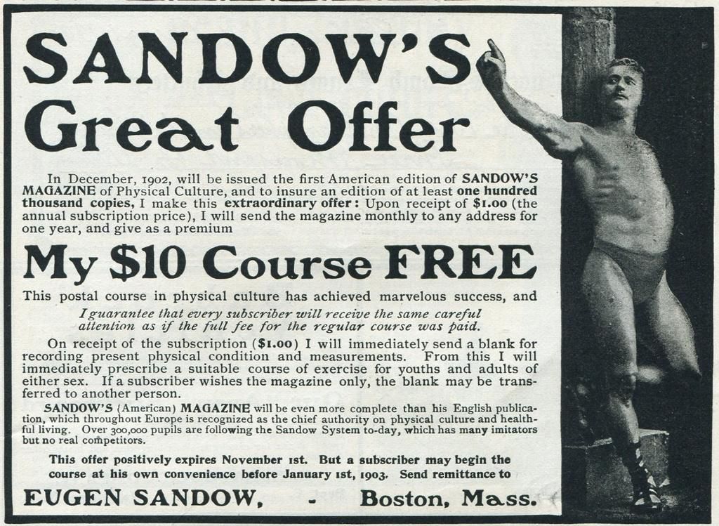 A 1902 advertisement for Sandow's Magazine of Physical Culture Started by legendary bodybuilder Eugen Sandow in 1898, the publication is recognized as the world's first bodybuilding magazine. Jay Paull/Getty Images