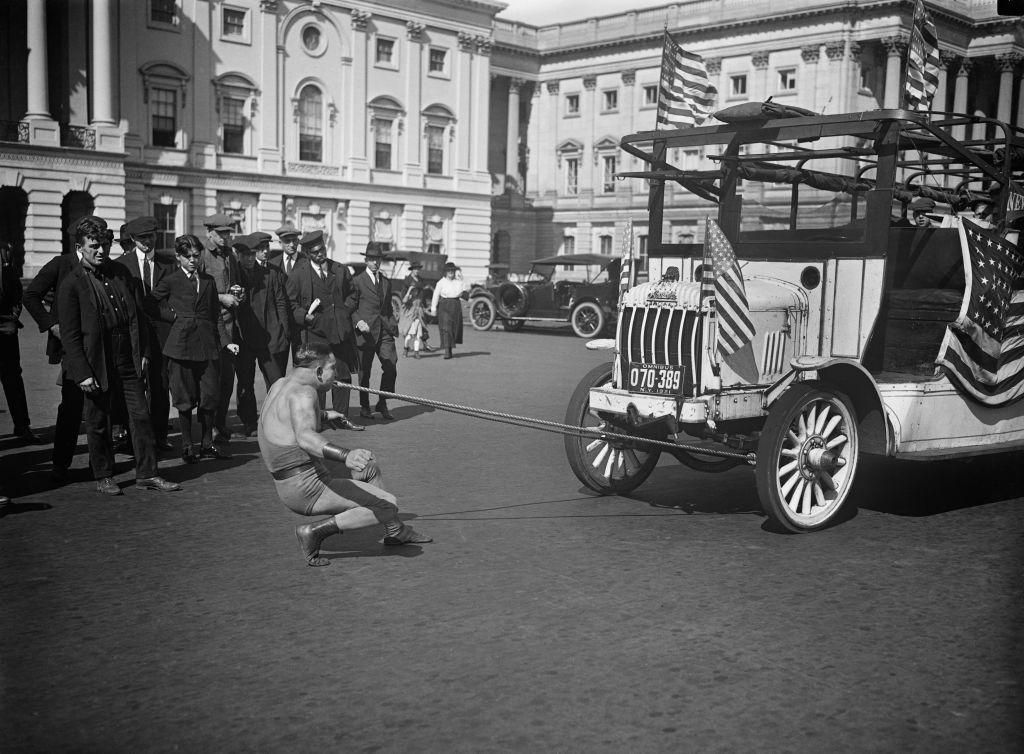 Strongman, 1921 A strongman pulls a car with his teeth outside of the U.S. Capitol building in Washington D.C. Universal History Archive - Getty Images