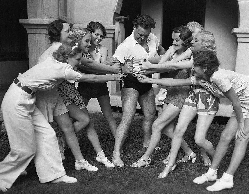 Galen Gough, 1934 In this photo, a 200-pound Gough holds firmly onto two horseshoes while seven women try to pull him out of place. Getty