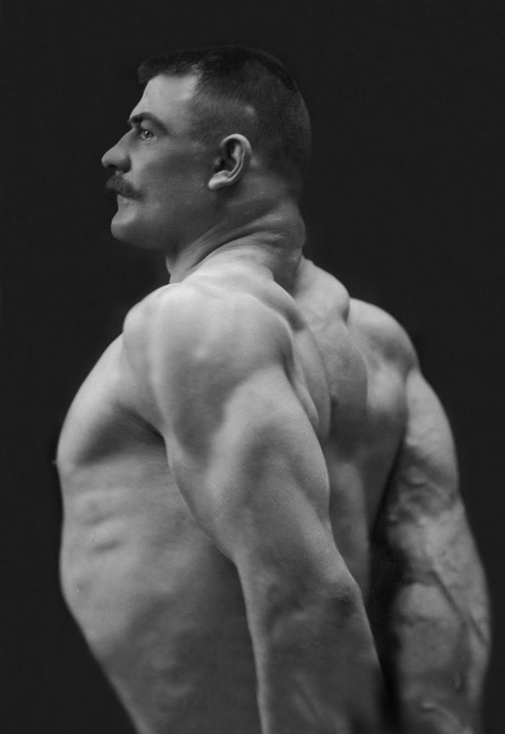 Strongman, 1900 A bodybuilder shows off his back muscles in a sideways pose. Buyenlarge - Getty Images