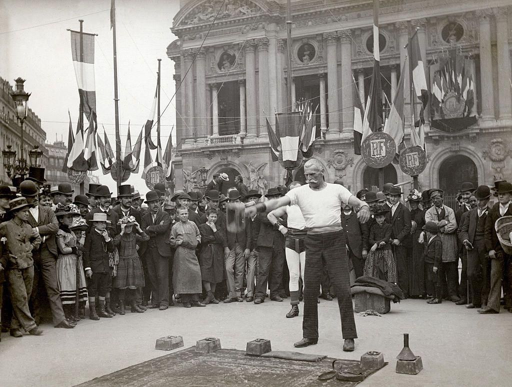 Strongman, circa 1900 In this photo, a strongman performs for a crowd at the Place de l'Opera in Paris, France. adoc-photos/Corbis via Getty Images