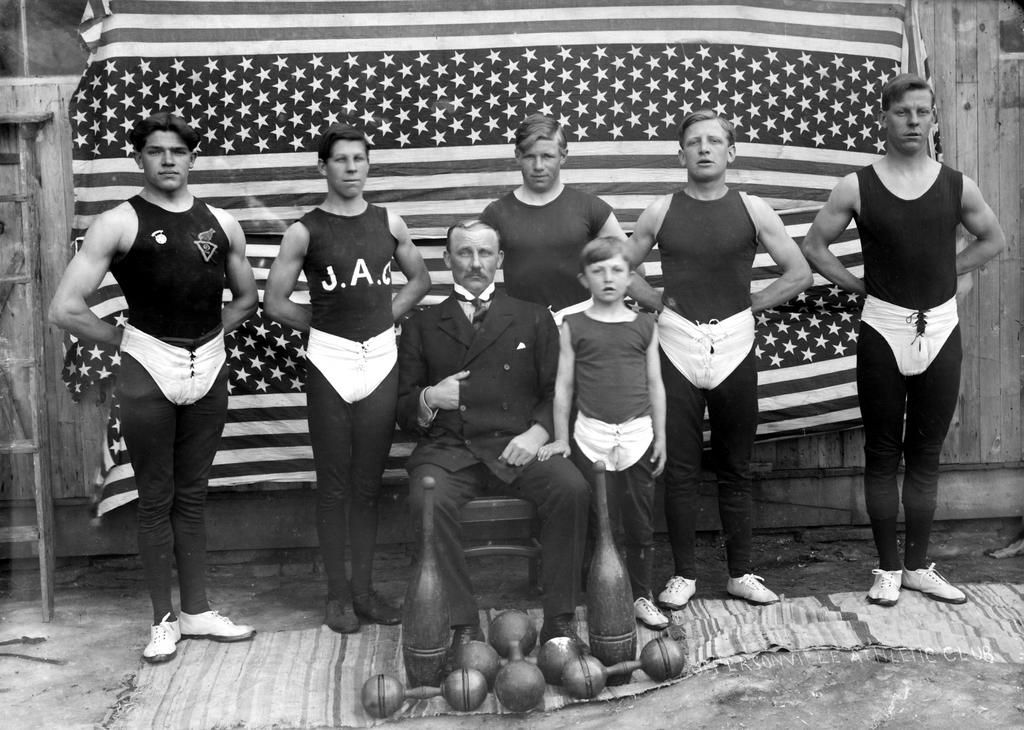 Young Strongmen, 1905 A group of young athletes, and members of the Jeffersonville Athletic Club in New York, pose in front of a sets of dumbbells. Kirn Vintage Stock - Getty Images