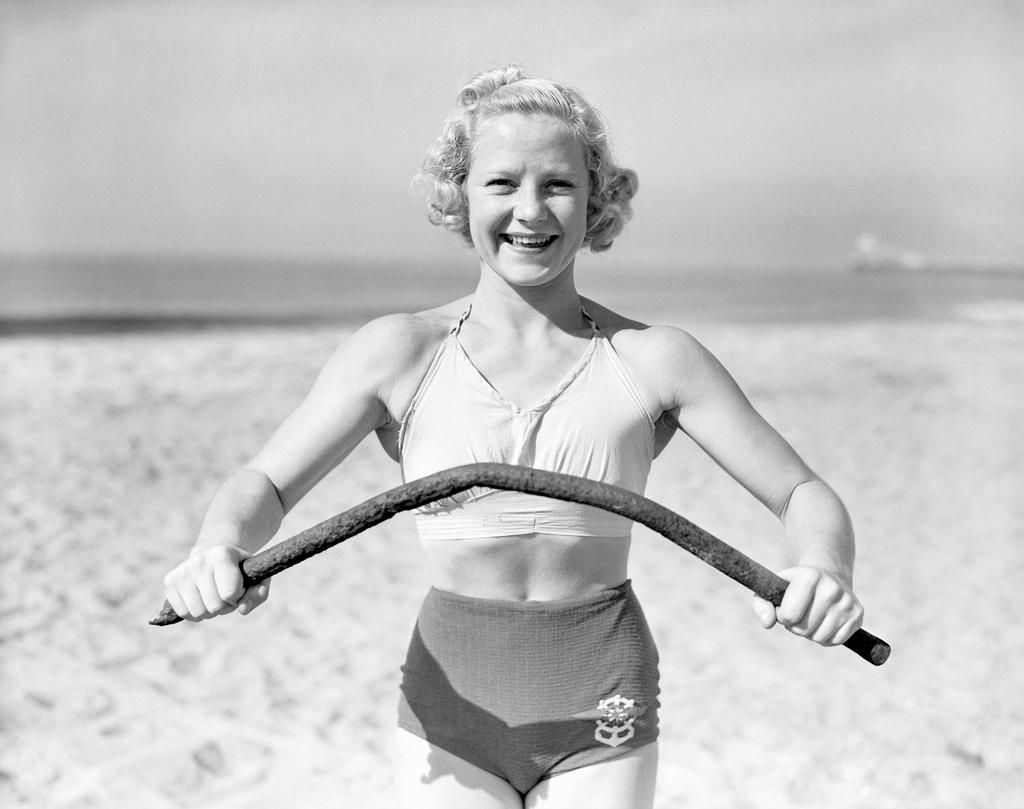 Relna Brewer, 1938 Female body builder Relna Brewer smiles on a beach as she holds a pole that she has bent. Bettmann - Getty Images