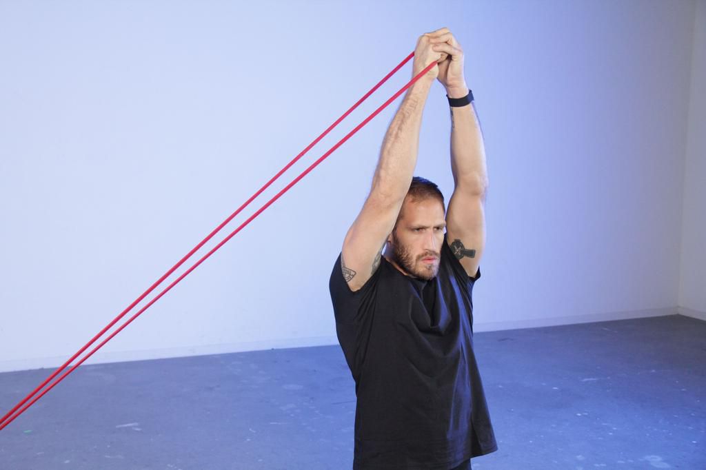Eb says: The other common mistake in the Pallof is some slight overcompensation. You know and can feel that band getting ready to pull you back in its direction, so you twist away from it extra hard. You think you're setting yourself up for success, giving yourself a buffer for the band.