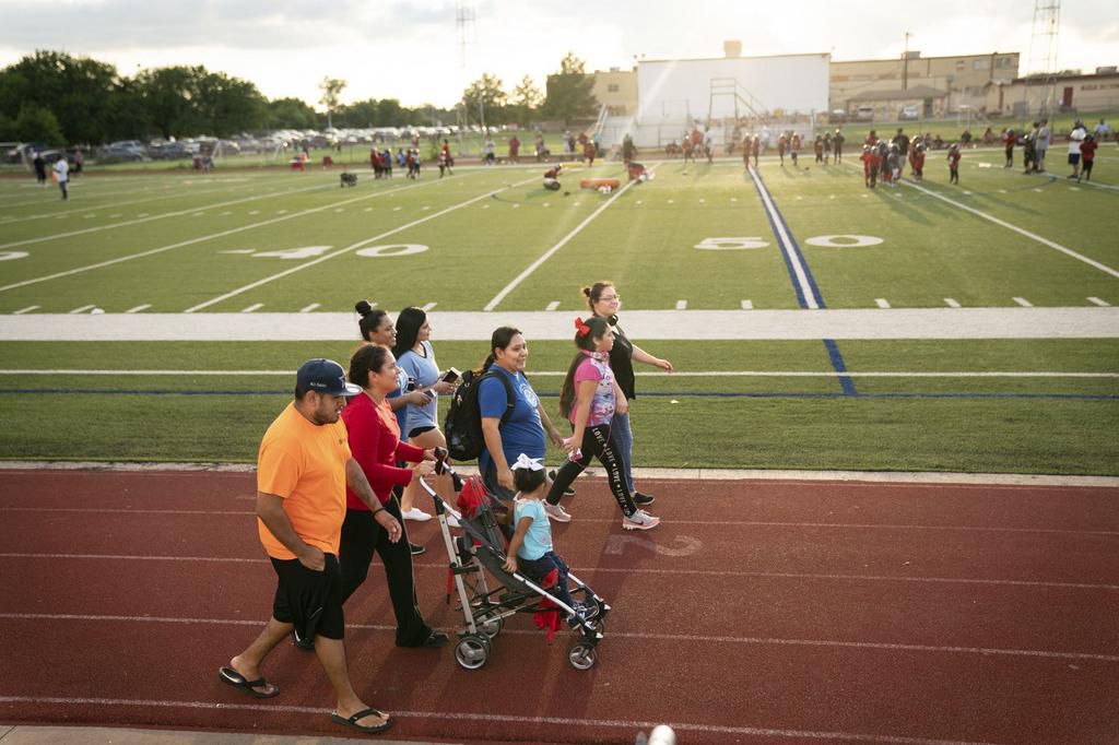 Activist Roxanne Martinez, wearing backpack, walks on a track in Fort Worth.