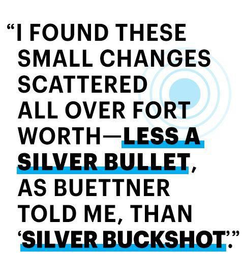 As resistance swelled, so did Buettners sense of urgency: Fort Worth had the potential to prove that his theory of wellness could help people on a grand scale, to prove that a major city could transform and buck the modern obesity trend. But the citys sense of rugged independence ran deep. Exasperated, he finally closed his laptop. You guys are not ready for this, he remembers saying. You should just keep doing what youre doing.