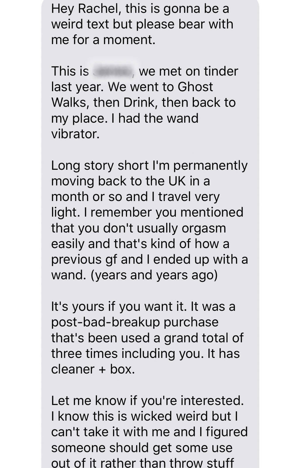 But that's exactly what happened to Rachel Coster, whose former Tinder date got back in touch see if she wanted his vibrator. In a tweet that's raked in 4,000 likes, Coster shared a screenshot of the guy's direct message-in which he starts by reminding her: "I had the wand vibrator." He explains that he's moving back to the United Kingdom, and that he plans on traveling "very light."
