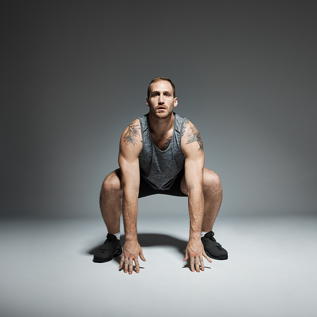 Eb says: Never be a jellyfish on the ground when doing burpees. Remember that that straight-body position, which you hit once when you put your hands and feet on the ground and then again when you lower your chest to the ground from there, is meant to be a plank. That means your abs are fired up and your glutes are contracted. You'll be much faster through both phases if you keep your core fired up, and you'll be protecting your spine and staving off any lower back injuries, too.