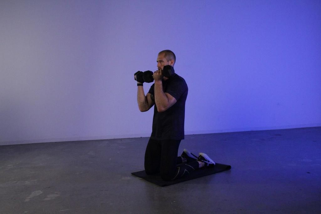 By getting in tall kneeling position, you'll be forced to more aggressively squeeze your glutes and abs. That'll take strain off your lower back and help you organize your spine better. You may need to work with a lighter weight, but you'll get a better overall press out of it.