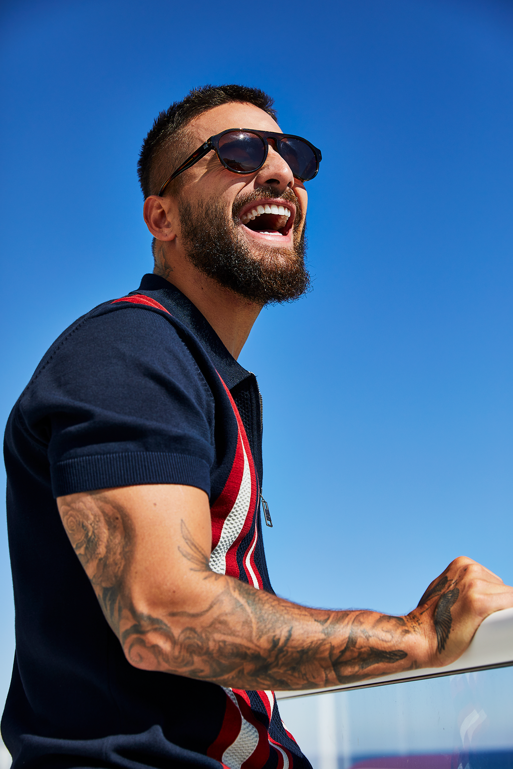 Buy Malumas Look: <a href="https://www.bensherman.com/collections/mens-polo-shirts/products/59356-25-textured-stripe-zip-through-polo-dark-navy" target="_blank">Ben Sherman knit polo</a>; <a href="https://www.amazon.com/Eyeglasses-Starck-eyes-0002Q-BLACK/dp/B07T5RKJ1P" target="_blank">Starck Eyes sunglasses</a>