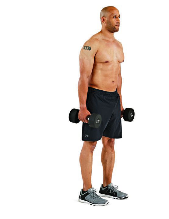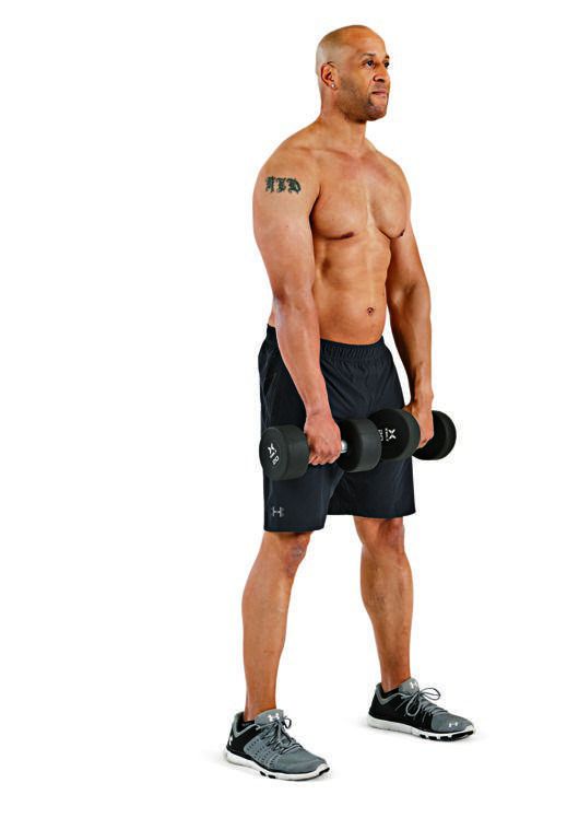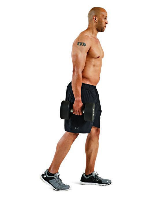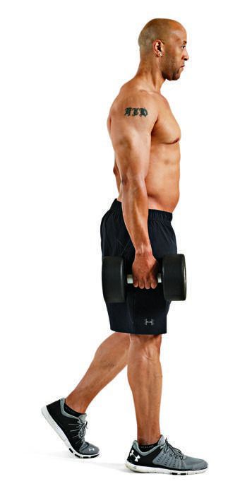 Grab a heavy dumbbell or kettlebell, hold it in your right hand, and let it hang at your side [A]. Keep your torso upright and straight as you walk [B]. (If youre in a small space, just walk back and forth for the prescribed number of steps.) Switch hands, and repeat. Thats one set.