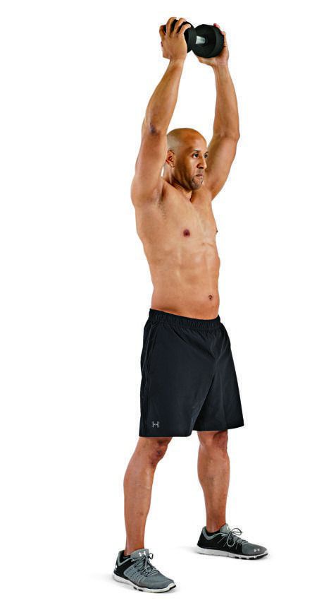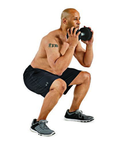 Hold a dumbbell by the ends, just below your chin, and stand with your feet shoulder-width apart. Lower your body until your thighs are at least parallel to the floor [A]. Push up explosively with your legs as you press the dumbbell overhead [B]. Return to the starting position and repeat.