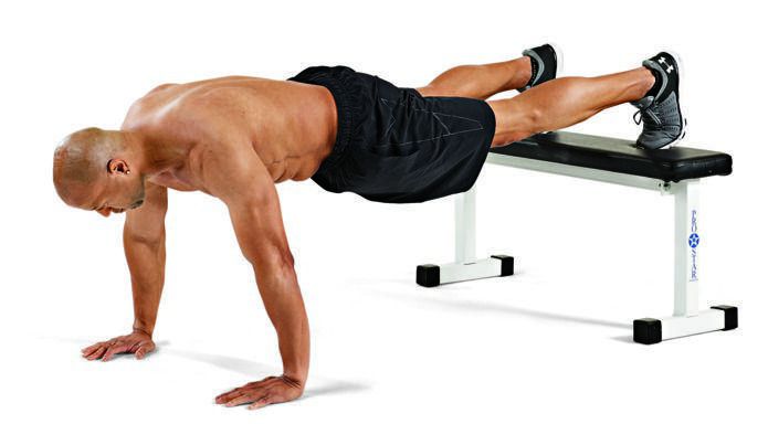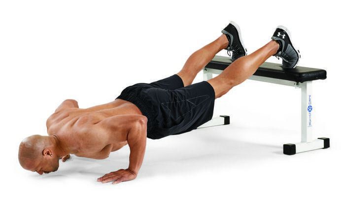 Assume a pushup position, but with your feet on a sturdy box or bench instead of the floor. Your arms should be straight and your hands slightly beyond shoulder width. Your body should form a straight line from your head to your ankles [A]. Bend your elbows and lower your body until your chest nearly touches the floor[B]. Pause, then push yourself back to the starting position.