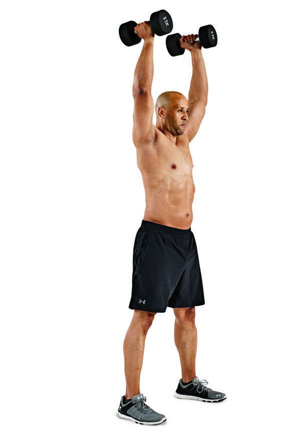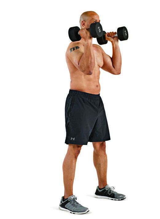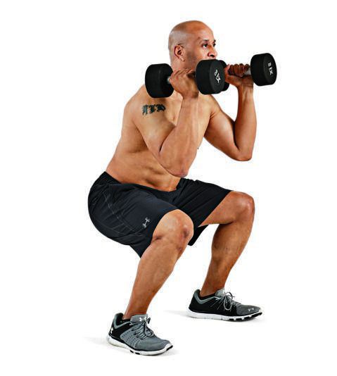 Hold a pair of dumbbells just outside your shoulders, palms in, and stand with your feet shoulder-width apart [A]. Lower your body until your thighs are at least parallel to the floor [B]. Push up explosively with your legs as you press the dumbbells overhead [C]. Return to the starting position and repeat.
