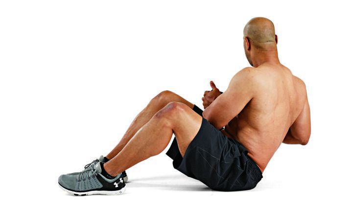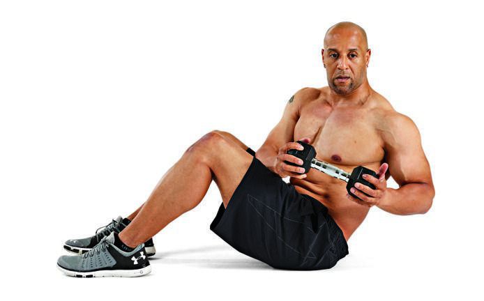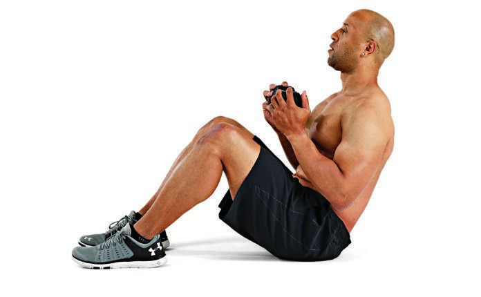 Sit on the floor with your knees bent and your feet flat. Hold a dumbbell with both hands next to your chest. Lean back so your torso is at about a 45-degree angle to the floor [A]. Brace your core and rotate your torso to your left as far as you comfortably can [B]. Reverse the movement and rotate all the way back to your right as far as you can [C]. Thats one repetition.