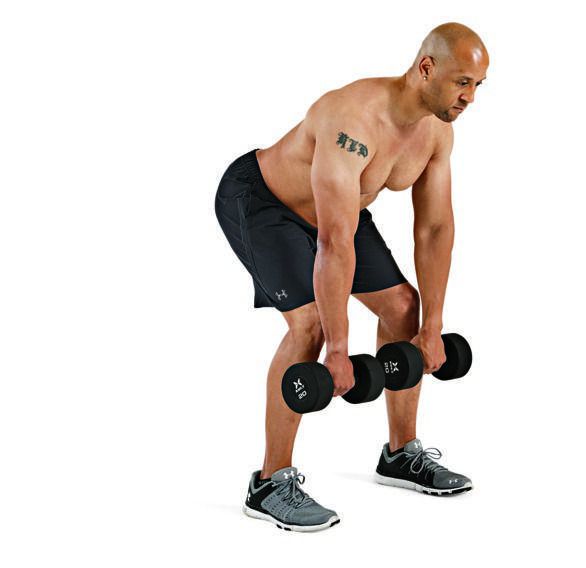 Hold a dumbbell in each hand in front of your thighs, palms facing your body. Your knees should be slightly bent and feet shoulder-width apart[A]. Without rounding your lower back, bend at your hips and lower your torso until its nearly parallel to the floor [B]. Pause and then rise to the starting position.